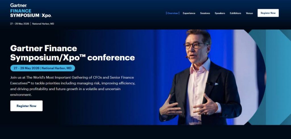 | Gartner Finance Symposium and Xpo | May 27 to 29, 2026 | National Harbor, MD, USA | Finance operating models, reporting structure, and data flow at scale |