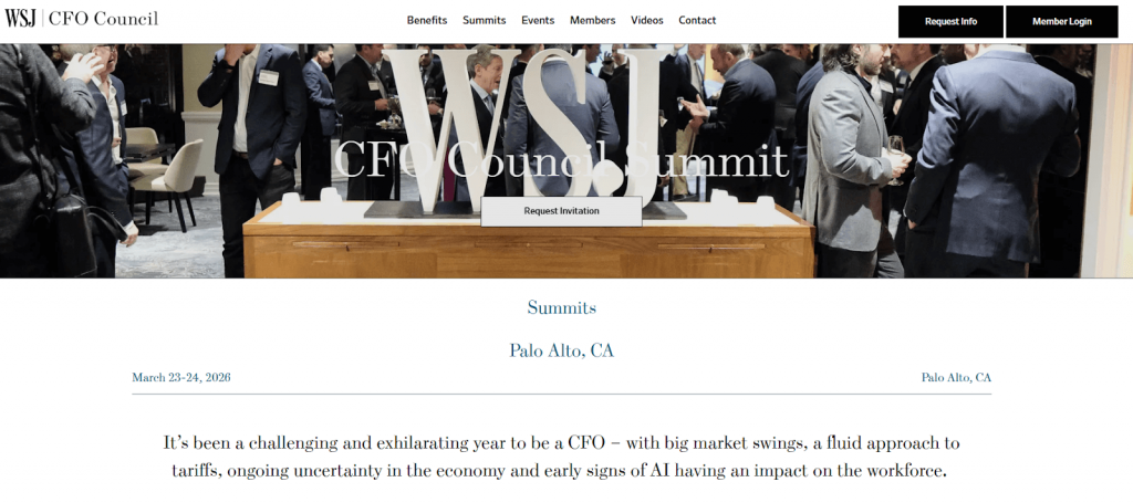 | WSJ CFO Council Summit | March 23 to 24, 2026 | Palo Alto, CA, USA | Executive-level decision making, governance, and investor dynamics |