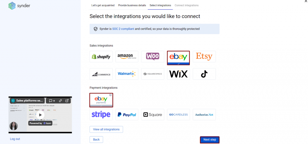 Sign in to Synder, open Select integrations, and connect your eBay account.