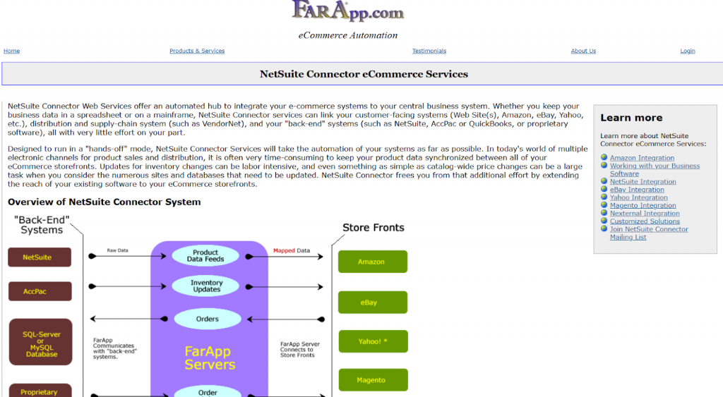FarApp is a NetSuite-focused ecommerce integration built to translate online sales activity into NetSuite records using predefined logic. It’s often chosen by teams that want ecommerce data to follow NetSuite conventions closely without building custom workflows.