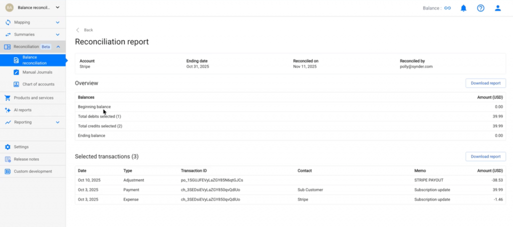 The Balance Reconciliation feature in Synder allows users to verify and confirm the accuracy of synchronized financial summaries before posting them to their accounting system. It ensures that the selected summaries match the expected starting and ending balances for a defined period, providing transparency, control, and precision over your financial data.