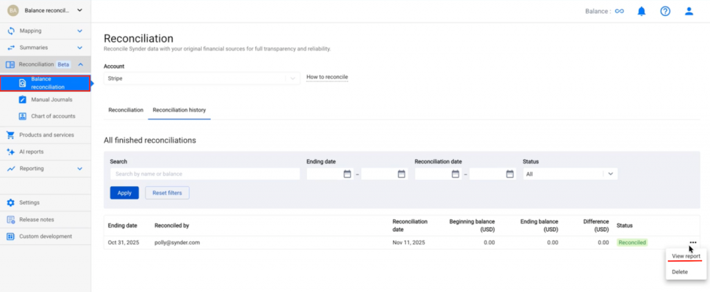 - Navigate to Reconciliation → Balance Reconciliation in the left-side menu.