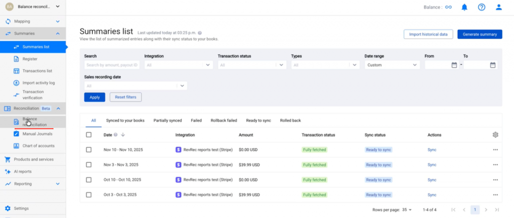 This feature is available for users working with daily or payout-based summaries on the summary sync mode, where maintaining alignment between integration details and account balances is critical.
