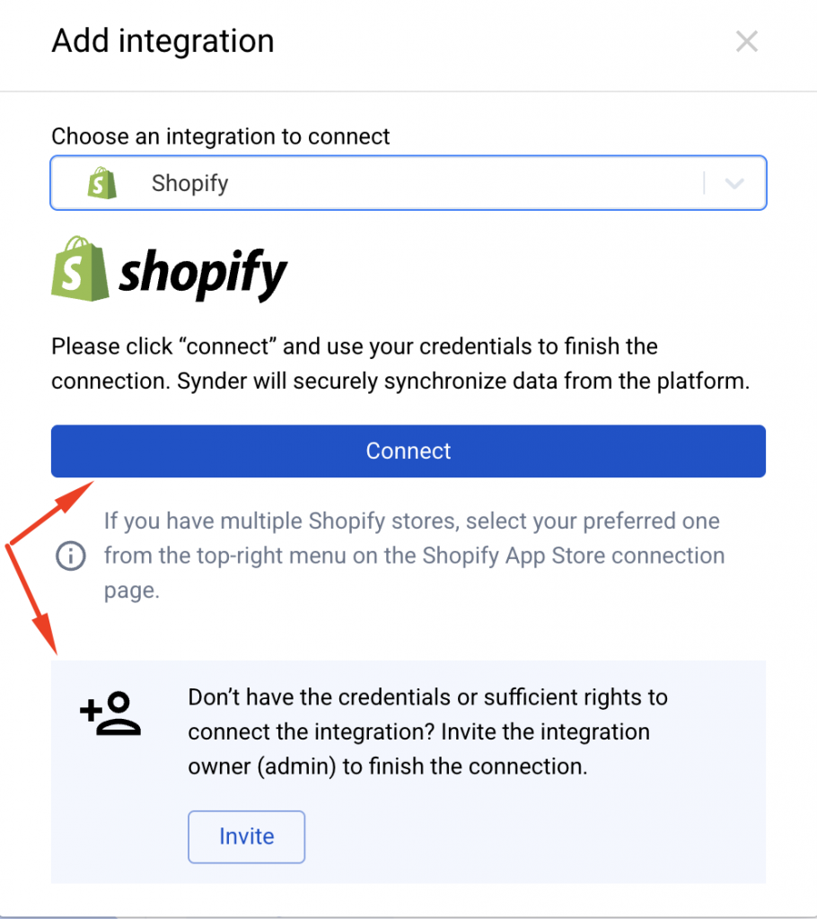 - Authorize the connection through your Shopify account. Alternatively, if you don’t have admin rights, send an invitation to the account owner.