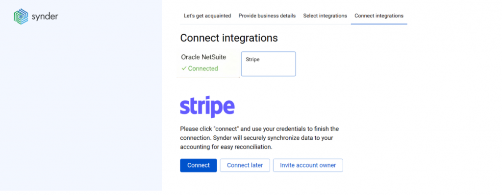 If you already have a Synder organization connected to NetSuite, you can easily add Stripe: