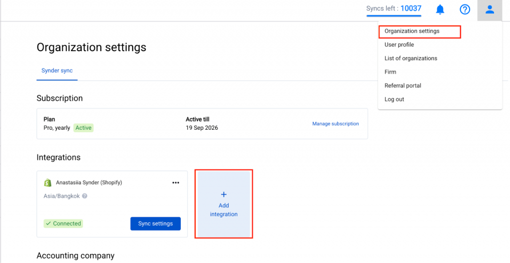 - Navigate to Organization Settings → Accounting Company (for NetSuite) or Integrations (for Stripe).