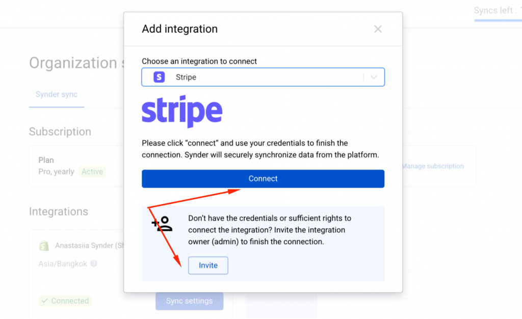 Click Connect next to Stripe and grant Synder permission to access your account. If you don’t have admin access in Stripe, use the Invite account owner option to send the connection link to the appropriate person.