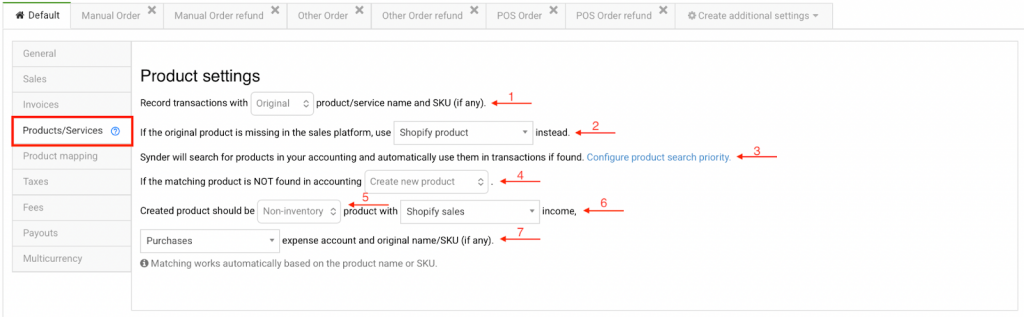 - Configure product search priority – Set whether Synder searches by SKU or product name first when matching products between Shopify and QuickBooks Online. Refer to Product Search Priority.