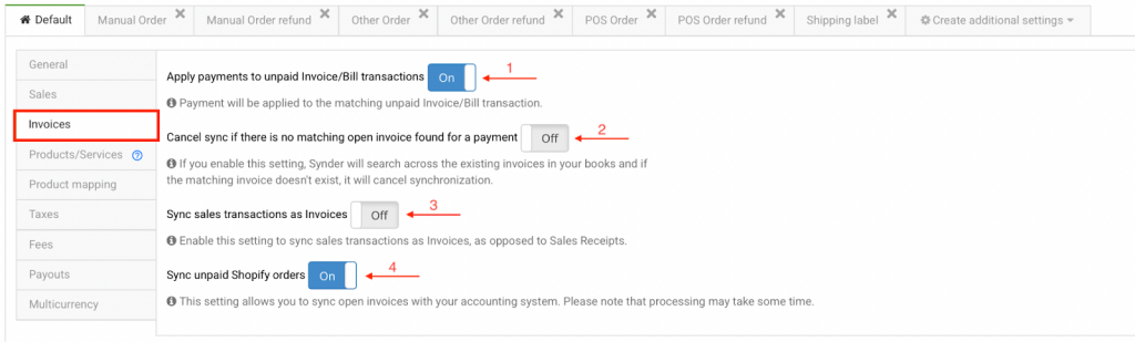 - Sync unpaid Shopify orders – Enable to sync open invoices with the accounting system. Processing may take time.
