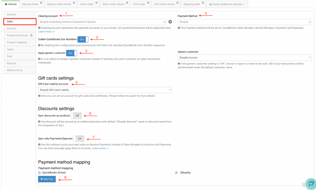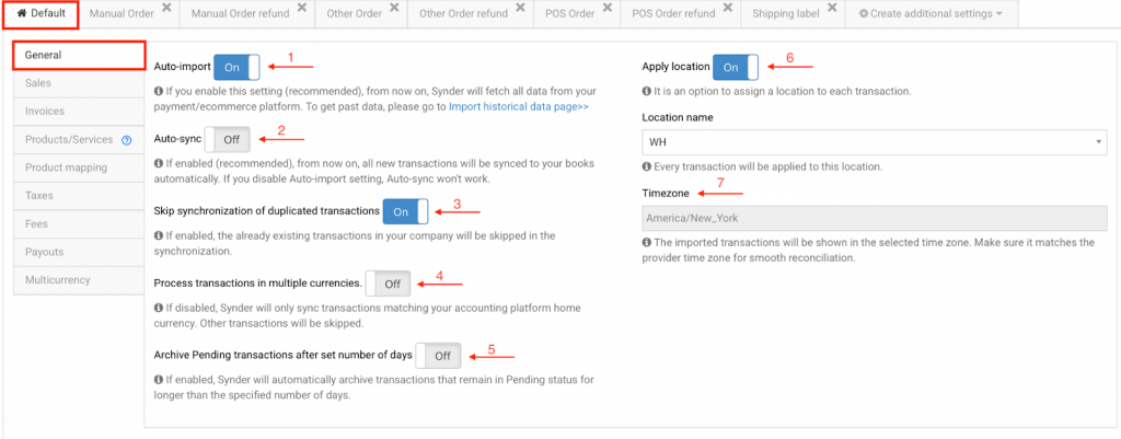 Use the Create Additional Settings option to categorize transaction types. Synder cannot process POS Order, POS Order Refund, Manual Order, Manual Order Refund, Other Order, or Other Order Refund transactions unless the corresponding settings are enabled. Ensure that settings are enabled or disabled on all tabs, not only the default tab. See the relevant guides for details: