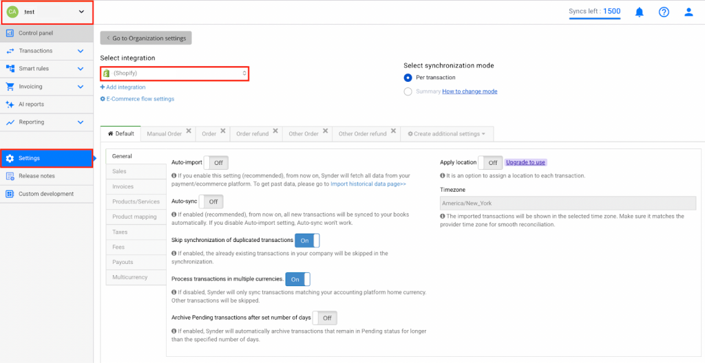- Auto-Import – Enables Synder to import transactions from Shopify automatically without affecting your sync balance or syncing them to QuickBooks Online. Disable this setting to import transactions manually.