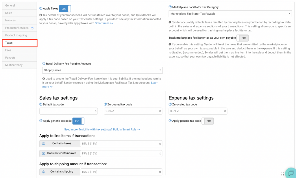 - Marketplace Facilitator Tax Category – Synder records marketplace-remitted taxes in both the sales and expense sections of transactions. Use this setting to select the account for tracking marketplace facilitator tax. Refer to Marketplace Facilitator Tax.