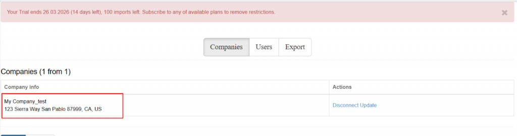 Once the authorization is complete, your accounting company appears on the account page. You are now ready to start importing data.