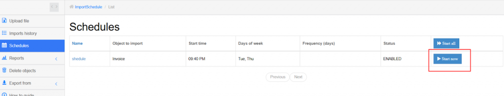 Manually start scheduled imports from the Schedules tab by clicking “Start Now” next to a specific import or “Start all” for all enabled Schedules.