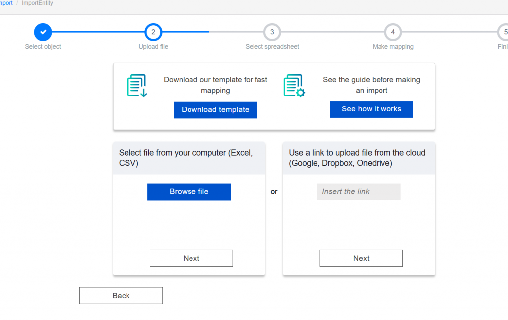 Next, choose how to upload your file – Upload a file from your computer or Paste a link to a cloud spreadsheet.