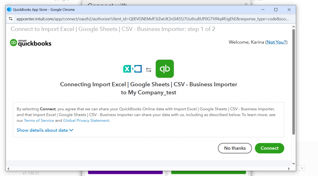- Authorize Business Importer to access your accounting company when redirected to your accounting software.
