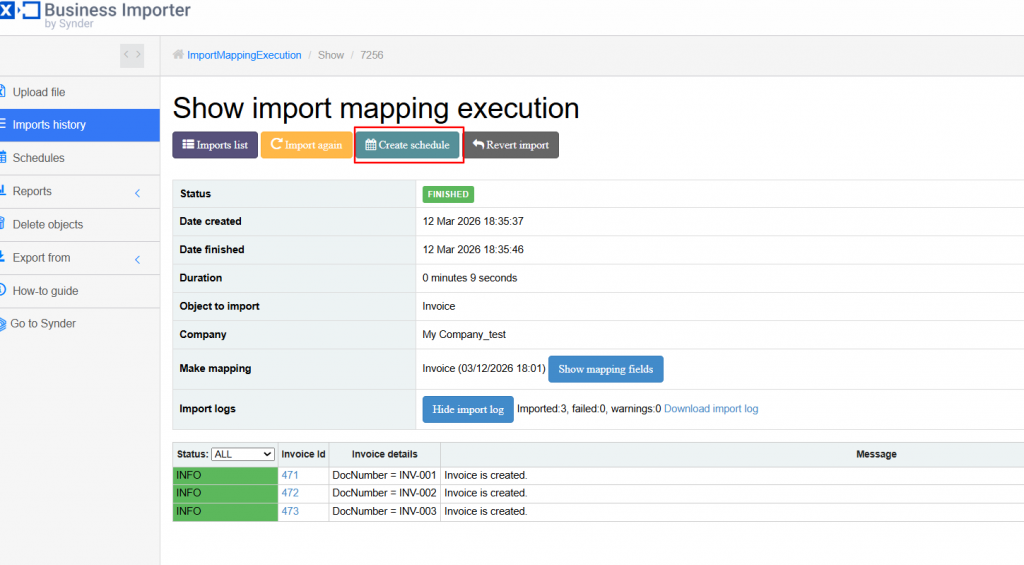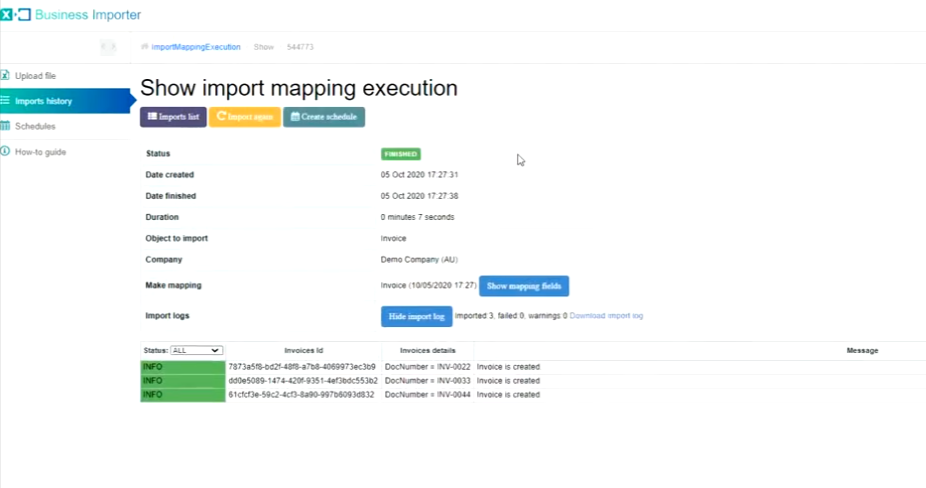 For example, if your file contained three invoices, the log confirms that all three were created.