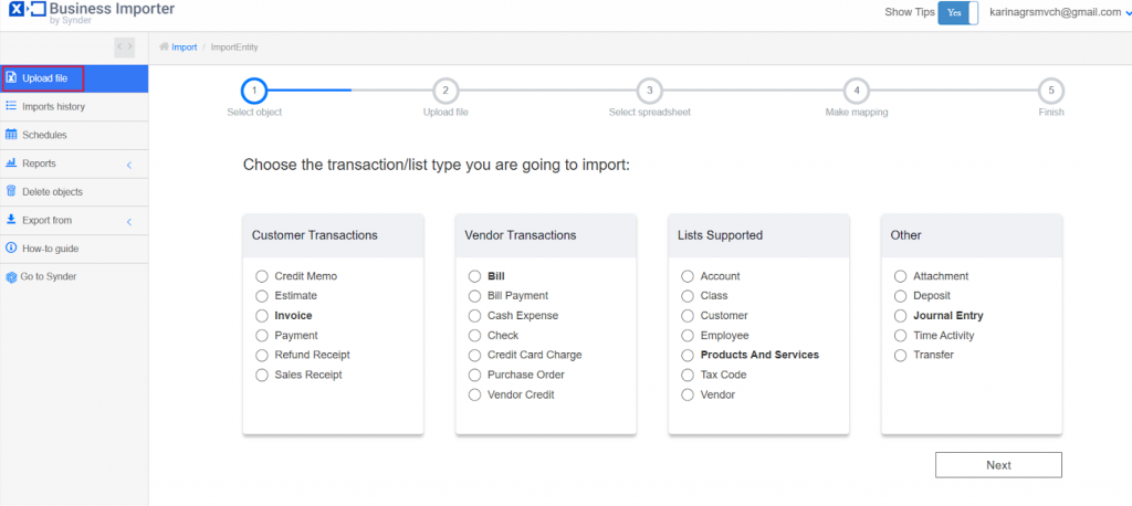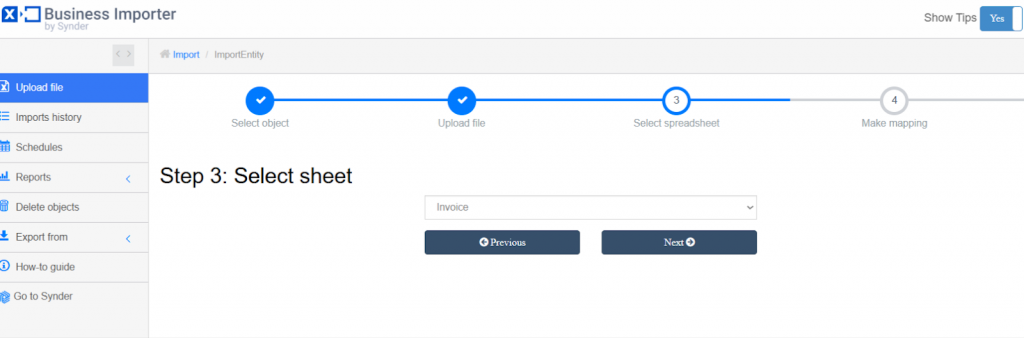 You will see a list of all the objects you can import. Choose the type of data you want to upload, for example, Invoices.