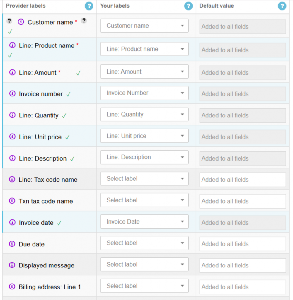 - The first column lists your accounting platform’s fields.