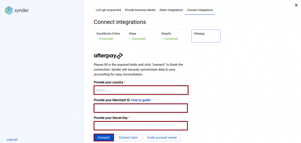 This article helps you connect Afterpay to Synder by entering your Merchant ID and Secret Key during Synder onboarding. It explains where to find these credentials and what to do if you can’t locate them. After completing these steps, Afterpay will show as Connected in Synder and will be ready for transaction import.