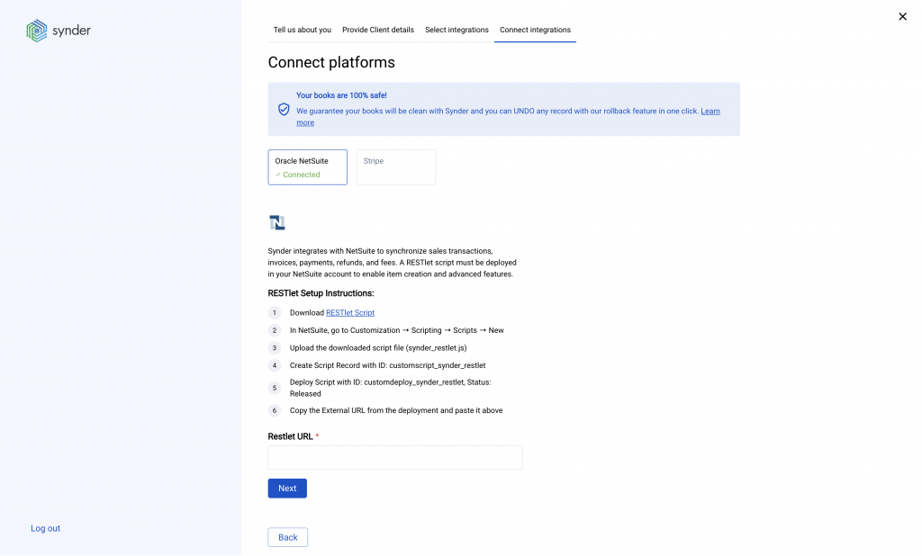 After you enter the required Oracle NetSuite account IDs and keys and click Connect, Synder will prompt you to provide a RESTlet URL.