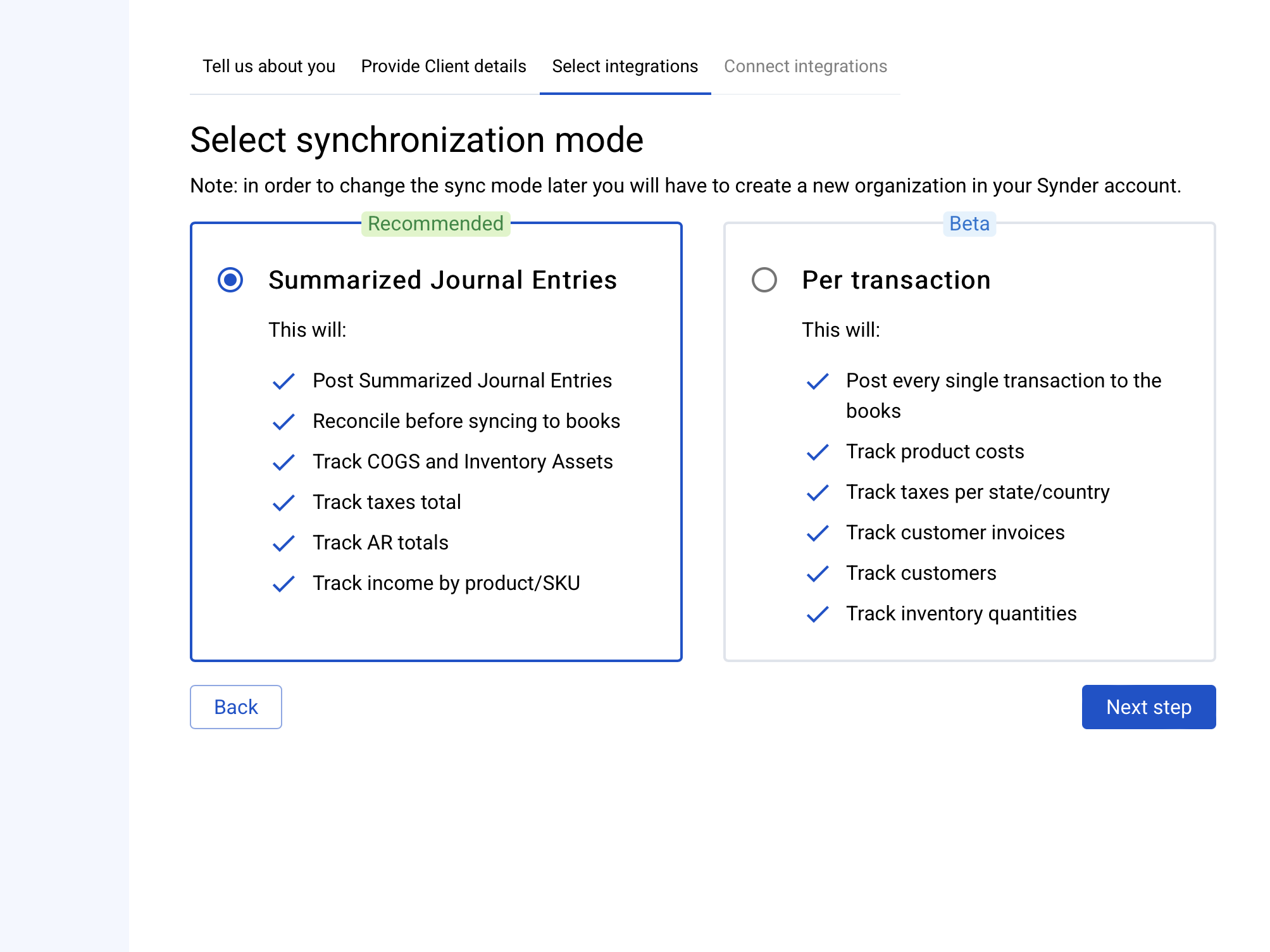 This extra step is required only for Per Transaction mode and allows Synder to sync customer-level and product-level details into your books.