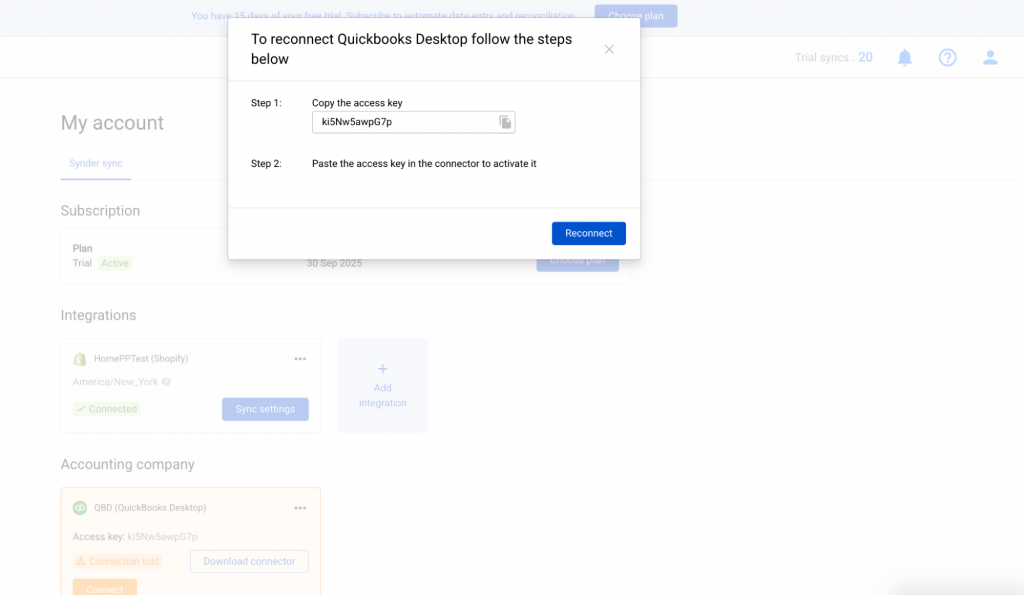 - For the final step, return to the Synder website dashboard and complete the process by clicking ‘Reconnect’. The Accounting Company section will now show a connected status on your QuickBooks Desktop.
