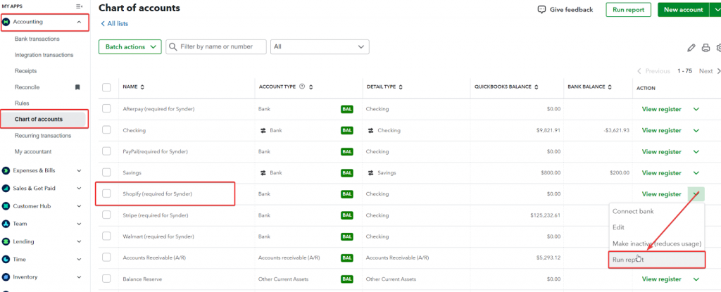 - Find your clearing account(s). It’s typically named with the following format, like Shopify (required for Synder).