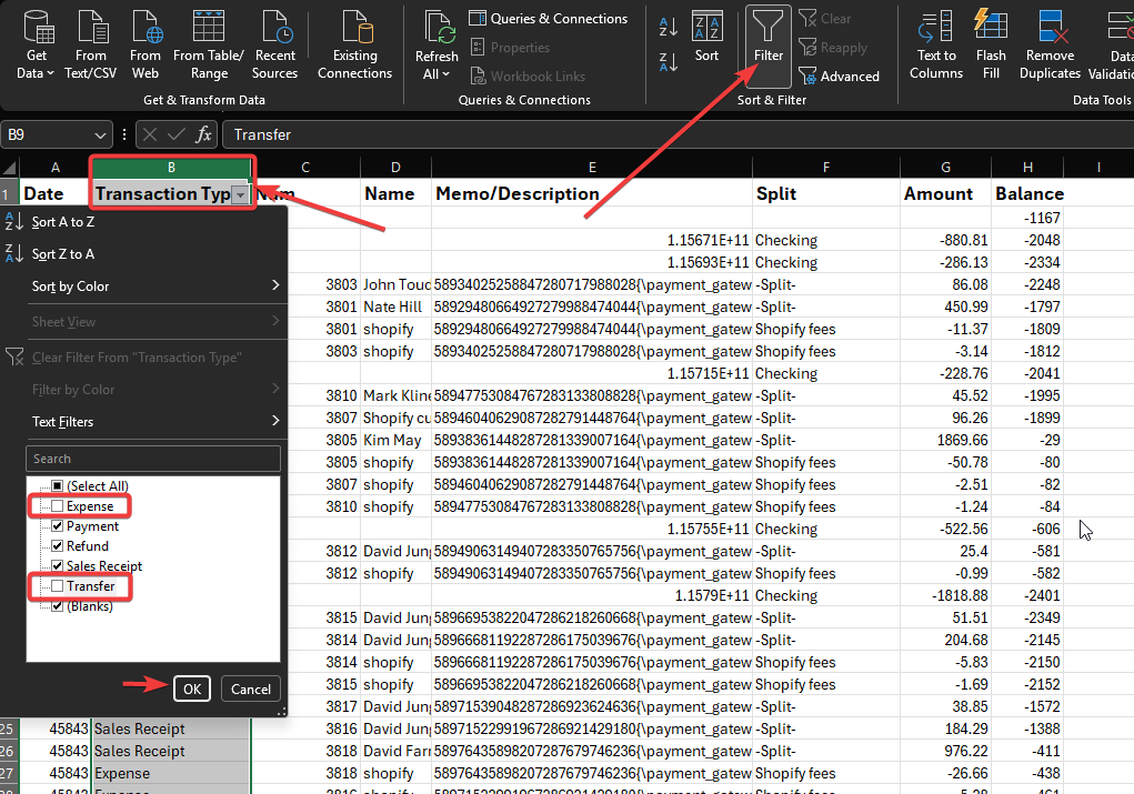 - Filter the Transaction Type column to exclude Expenses and Transfers.