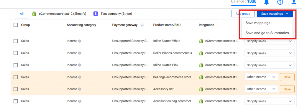 After completing the following steps, you will have summaries grouped by items/SKUs, and each product-related summary line will affect the chosen income accounts from your mappings list.