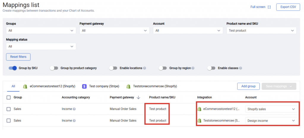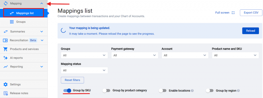 - Once you switch to “Group by SKU” and map the products to income accounts, the mapping will affect only new summaries and entries with pending or ready to sync statuses.