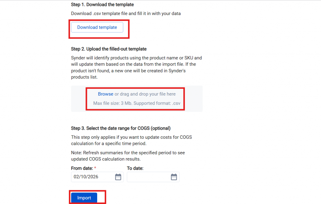 - If a product name or SKU already exists in Synder, Synder updates the category based on the uploaded file