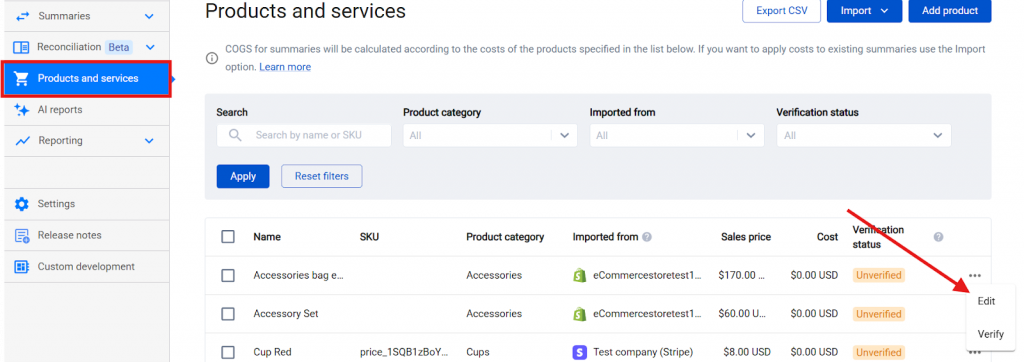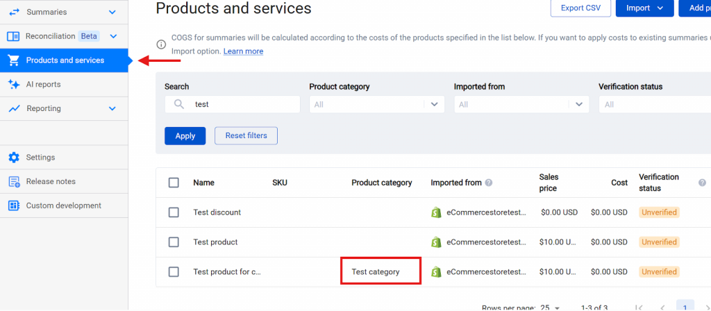 For Shopify, WooCommerce, and Square integrations, Synder automatically imports product categories and displays them in the Products and Services tab if categories are set up in the source platform.
