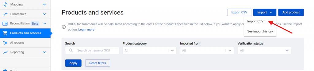 Products imported without assigned categories appear under a No category row on the Mapping page. Review the Products and Services tab and categorize any products as needed.