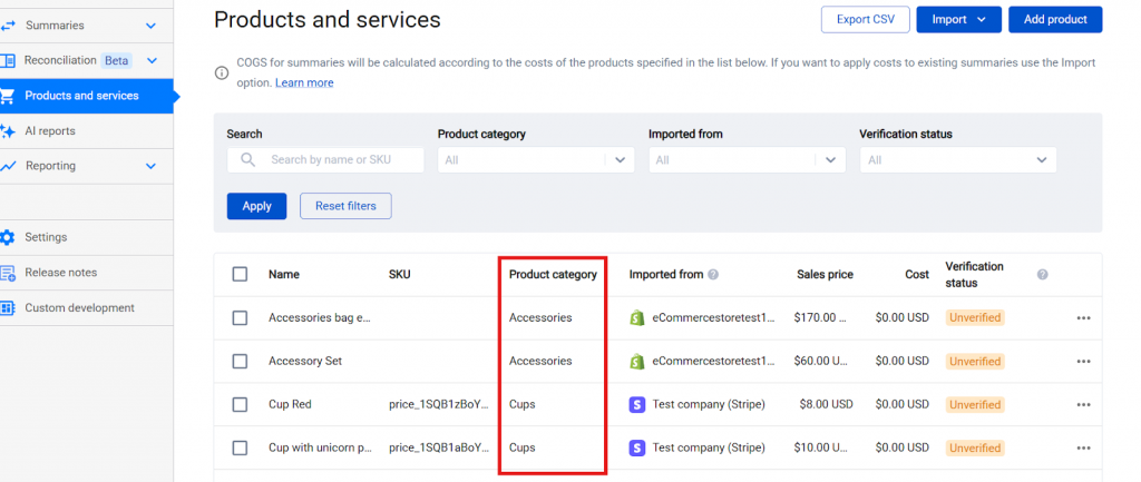 After you import transactions from your integrations, Synder will fetch the product category automatically: