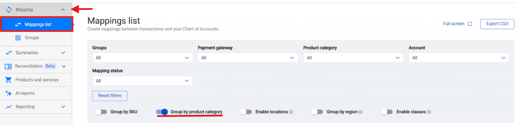 - Synder can group sales by either product/SKU or product category, but you cannot enable both options simultaneously on the Mapping tab.