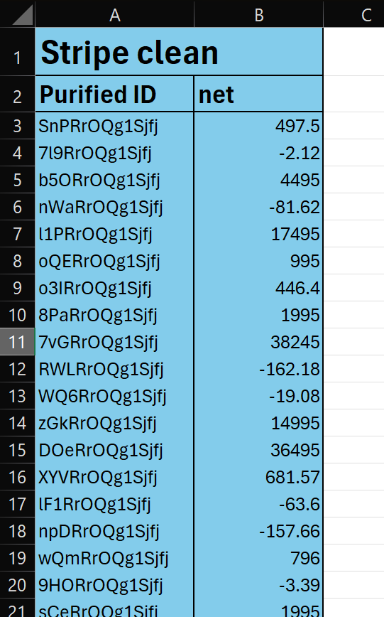 - Copy your cleaned Stripe IDs and amounts to columns A and B.