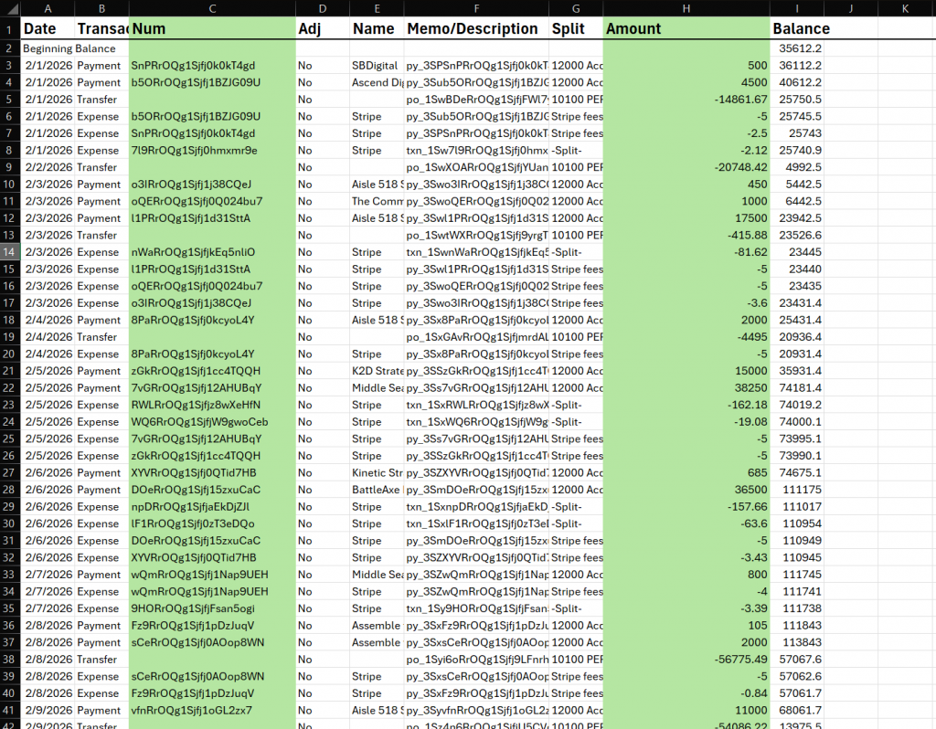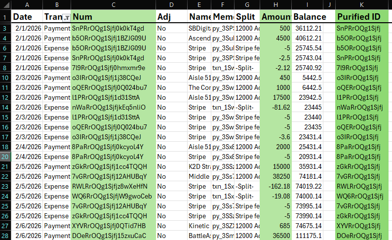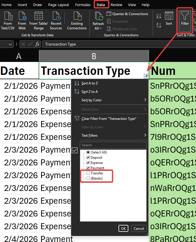The QuickBooks Online report also contains details that aren’t needed for comparison. You only need the Num and Amount columns. However, first, we need to remove payout (transfer) entries and any empty cells.