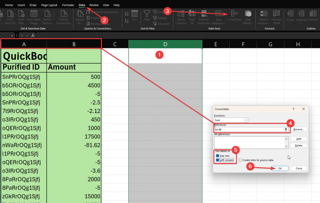 - Go to Data → Consolidate.