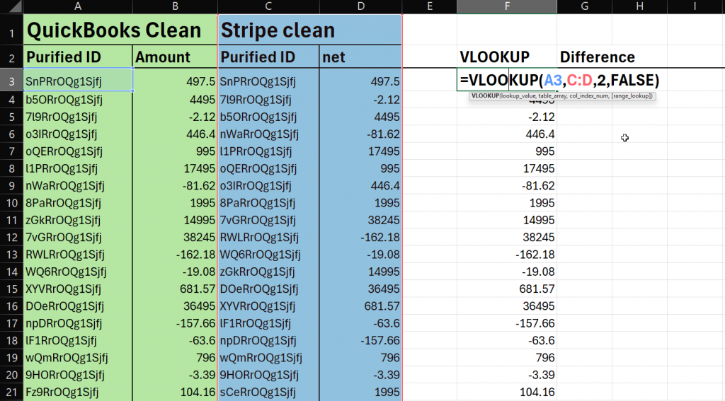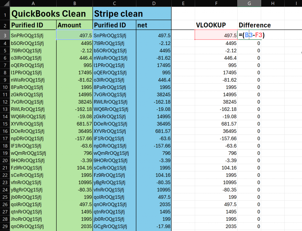 In the Difference column, calculate the difference by subtracting the looked-up amount from the Stripe amount.
