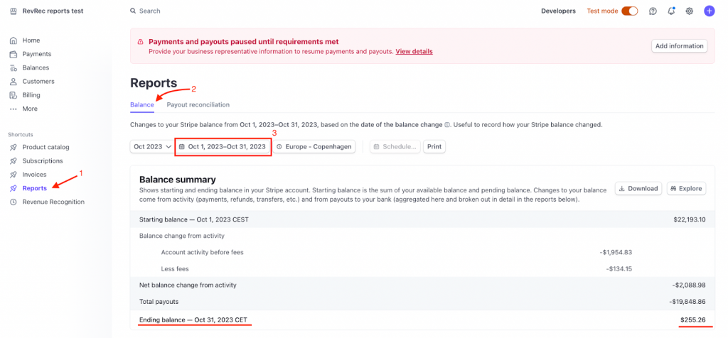 - Identify the starting and ending balance of your Stripe account
