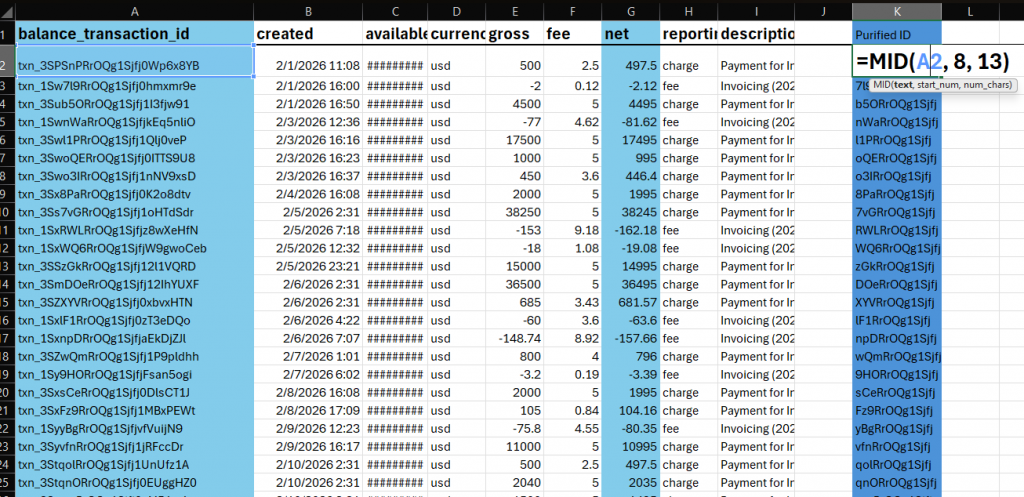 The balance_transaction column contains IDs that need to be cleaned for easier matching. You can use the following formula to extract the clean ID: