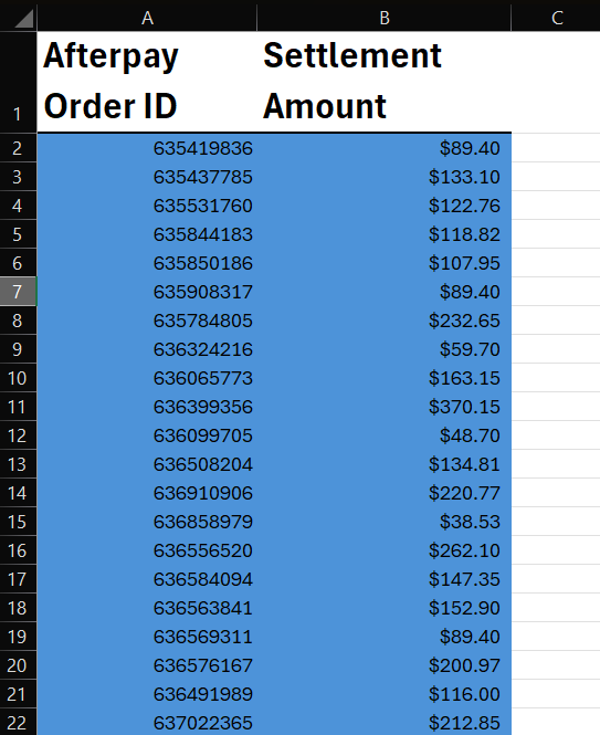 Create a new clean Afterpay report by copying the values of Afterpay Order ID and Settlement Amount columns into a new sheet..