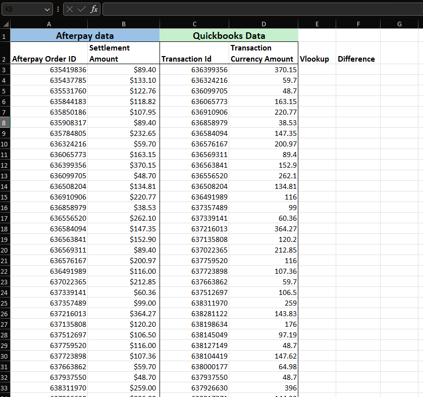 In the Difference column, calculate the difference by subtracting the looked-up amount from the Afterpay amount.
