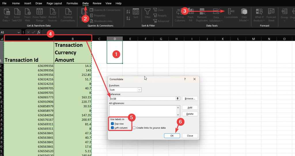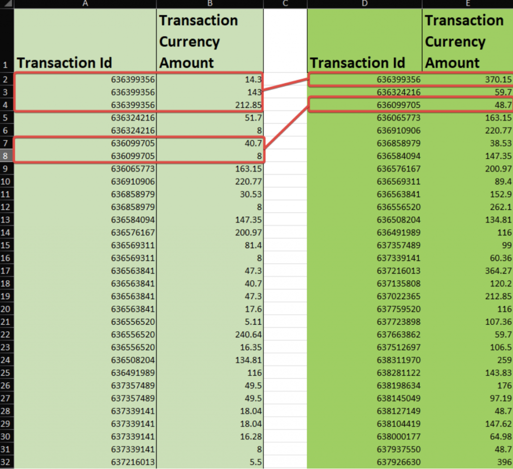 As a result, Excel will group multiple transactions with the same ID into one and sum their amounts. Here’s how the end result should look like.
