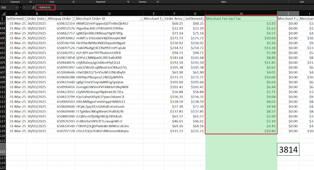=SUM(H:H), where H is the column where Merchant Fee excl Tax is located.