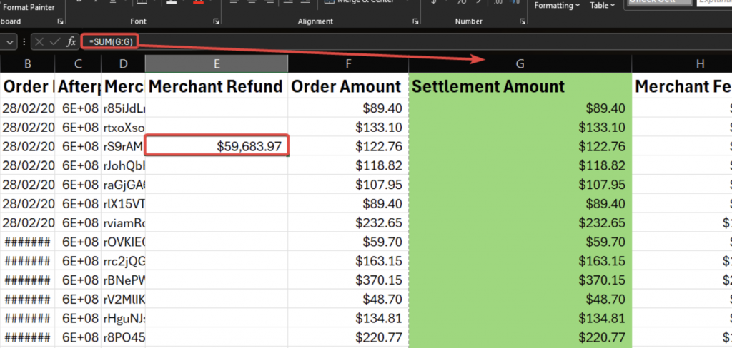 From the same report, sum the Settlement Amount column using =SUM(G:G) function.