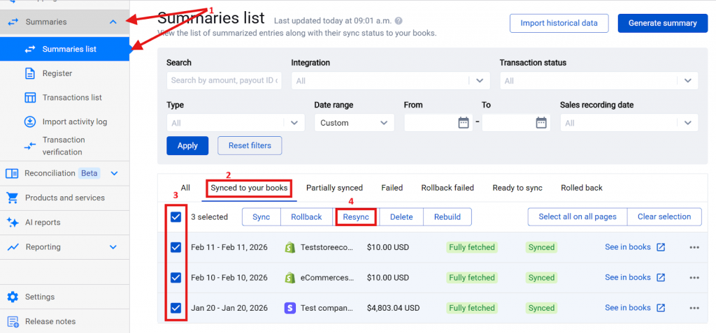 After completing this process, the summary status will change to Ready to sync. You can now sync the summaries to your accounting platform!