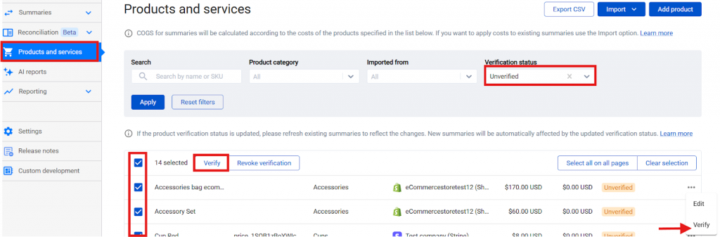 If even one product within the summary is unverified, it will be flagged with Attention Required status. You can access “Products and services” tab from the left-side menu, filter by verification status → Unverified → Verify the products.