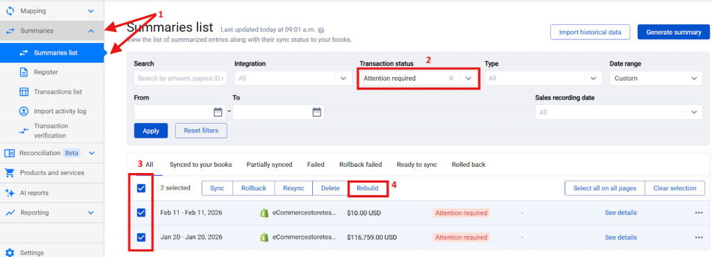Once you’ve enabled this feature and updated the product verification status, you will need to rebuild the summaries. Rebuilding will remove ‘Attention Required’ status and allow summary synchronization to your accounting platform.